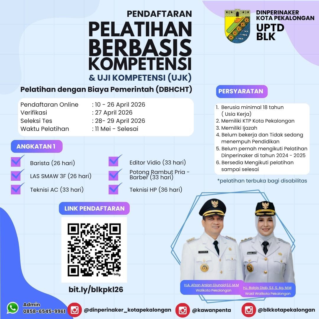 PEMERINTAHAN Daftar Sekarang! BLK Pekalongan Buka Pelatihan Gratis, Kesempatan Tingkatkan Skill dan Kantongi Sertifikat Kompetensi 15 April 2026 [13:12:55]